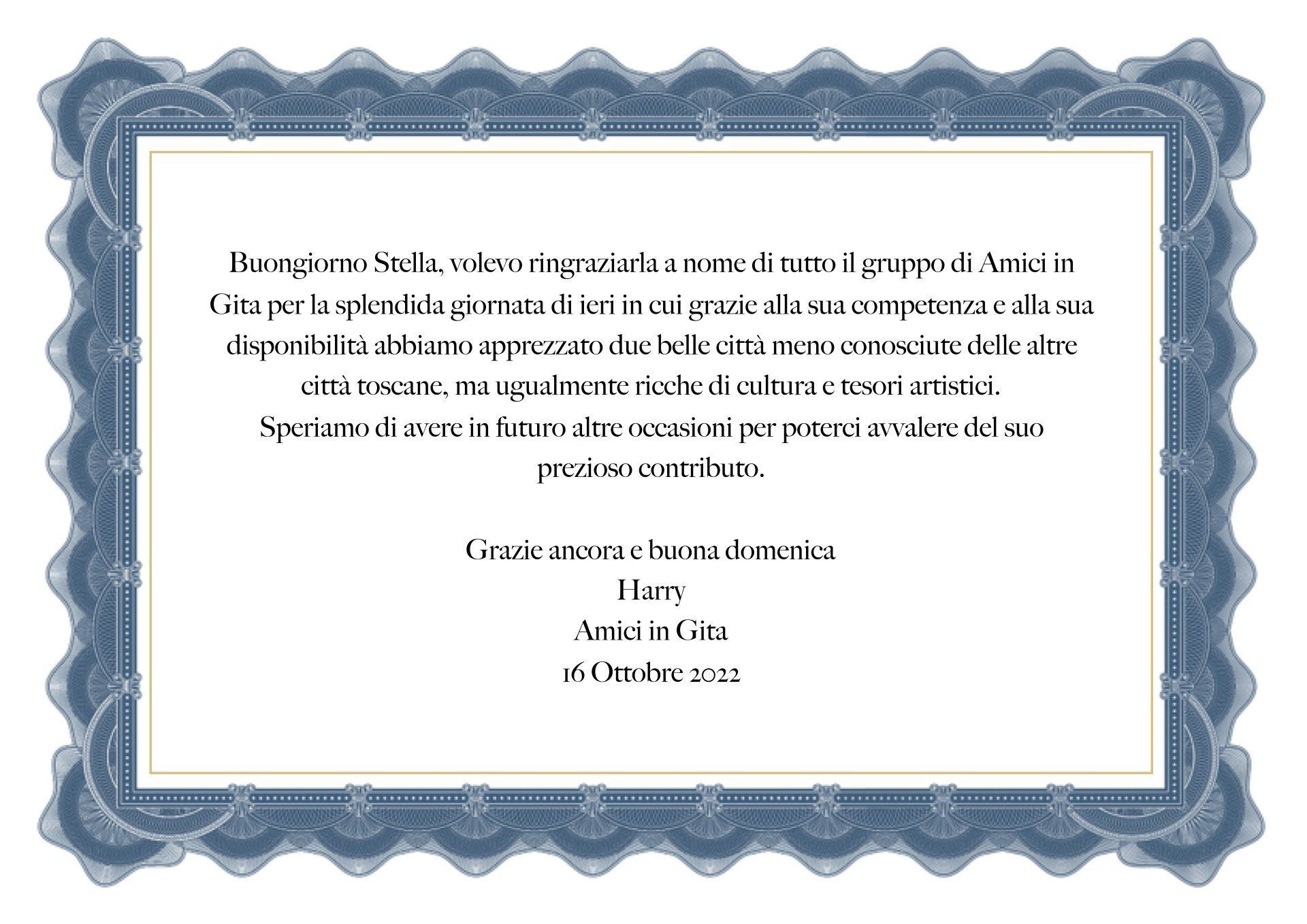 Sono Stella Fabiano, guida turistica da oltre 20 anni. Ho una preparazione storico artistica e sono innamorata della toscana. Ho frequentato numerosi corsi e mi sono specializzata in molte città toscane.